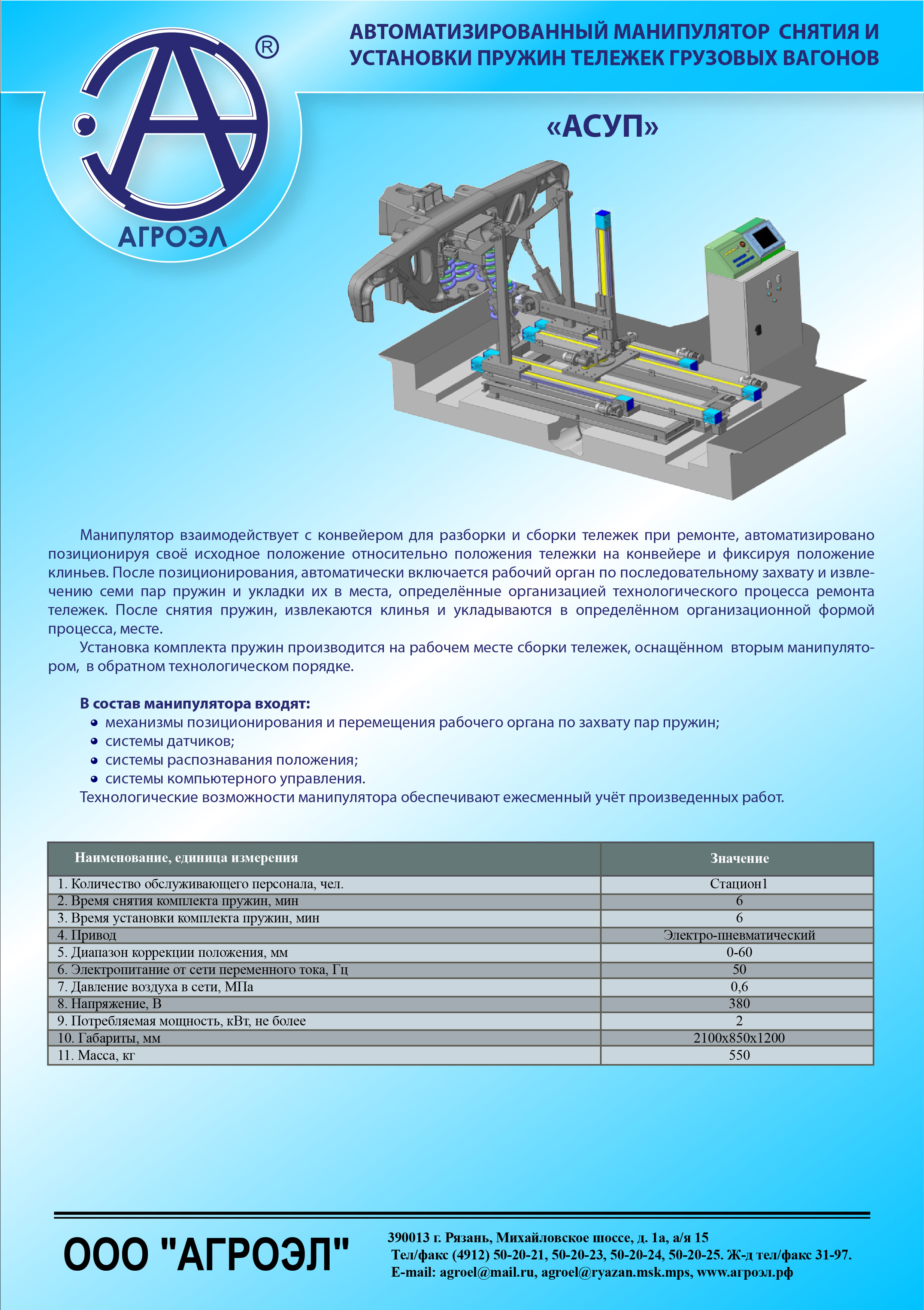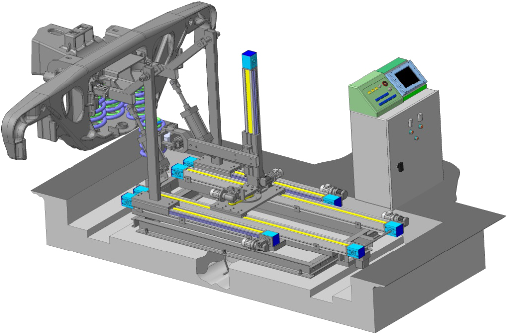 Манипулятор взаимодействует с конвейером для разборки и сборки тележек при ремонте, автоматизирова но позиционируя своё исходное положение относительно положения тележки на конвейере и фиксируя положение клиньев. После позиционирования, автоматически включается рабочий орган по последовательному захвату и извлечению семи пар пружин и укладки их в места, определённые организацией технологического процесса ремонта тележек. После снятия пружин, извлекаются клинья и укладываются в определённом организационной формой процесса, месте. Установка комплекта пружин производится на рабочем месте сборки тележек, оснащённом вторым манипулятором, в обратном технологическом порядке. В состав манипулятора входят:
